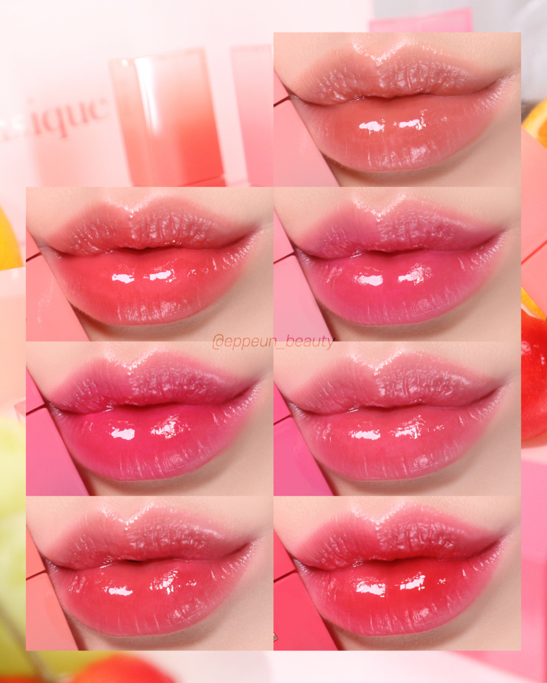 쥬시듀이틴트는 대체로 채도가 있는 편이다. 그런데 막 촌스러운 컬러는 아니고 진짜 데일리로 넘 잘 바를 것 같은 그런 예쁜 컬러들~! 그나저나 어떻게 이렇게 맑은 느낌으로 수분감 팡팡한 광택감이 나는지... 틴트 광택도 여리여리하니 넘 예쁨.