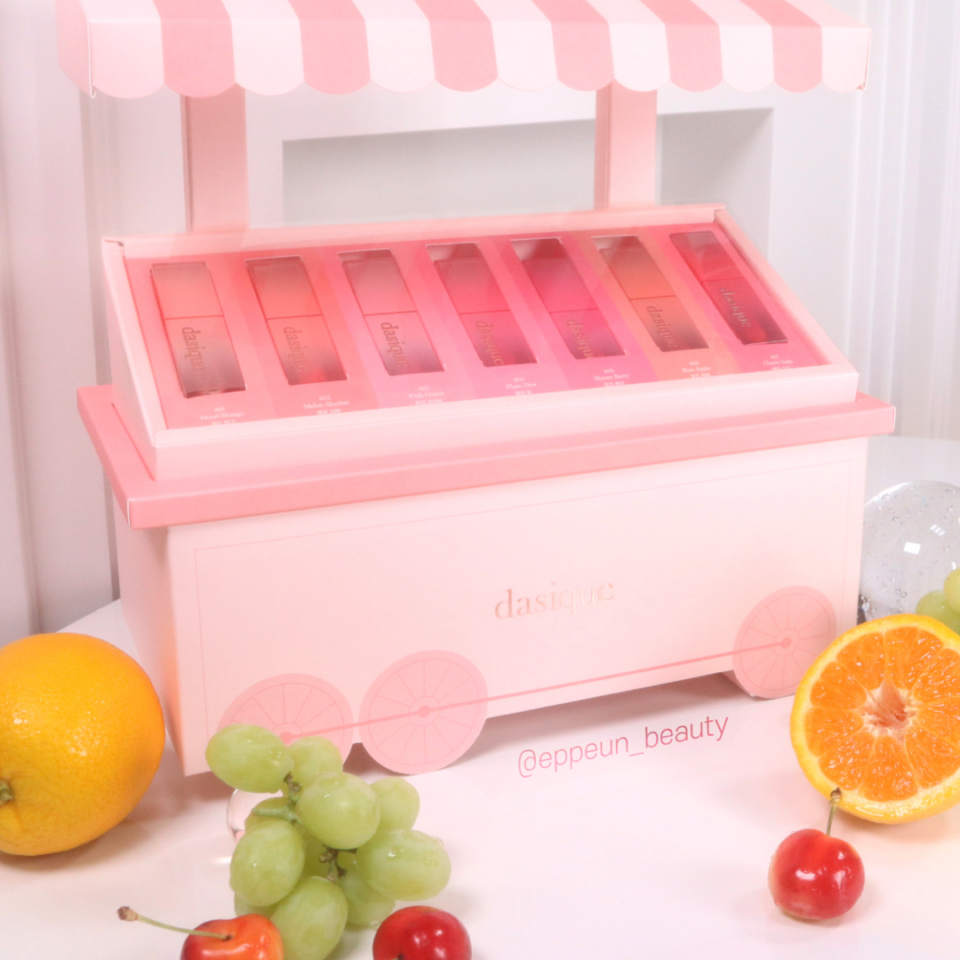 데이지크 이번 신상 쥬시듀이틴트는 당도 높은 7가지 생과일 컬러가 얇게 맑착(맑게 착색)되어 수분 가득 과즙 코팅을 선사하는 틴트다. 제품 패키지부터 벌써 생기뿜뿜 광초ㅑ르르한 광택감이 넘 잘 느껴짐. 기대기대!