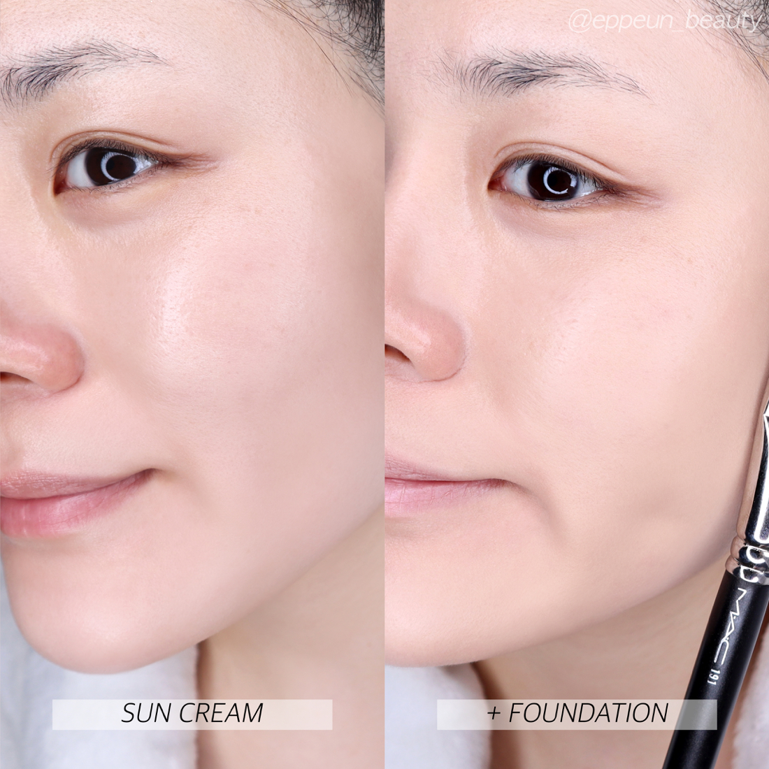 건성 기준 입븐언니에겐 오히려 피부 표현을 더 예쁘게 해준 것 같았던! 메이크업 베이스를 덧발랐을 땐 선크림 특유의 유분기가 약간 사라지는 편이니 참고하시길!(사용한 도구가 뭐냐에 따라 피부표현 약간 차이 있음 주의)