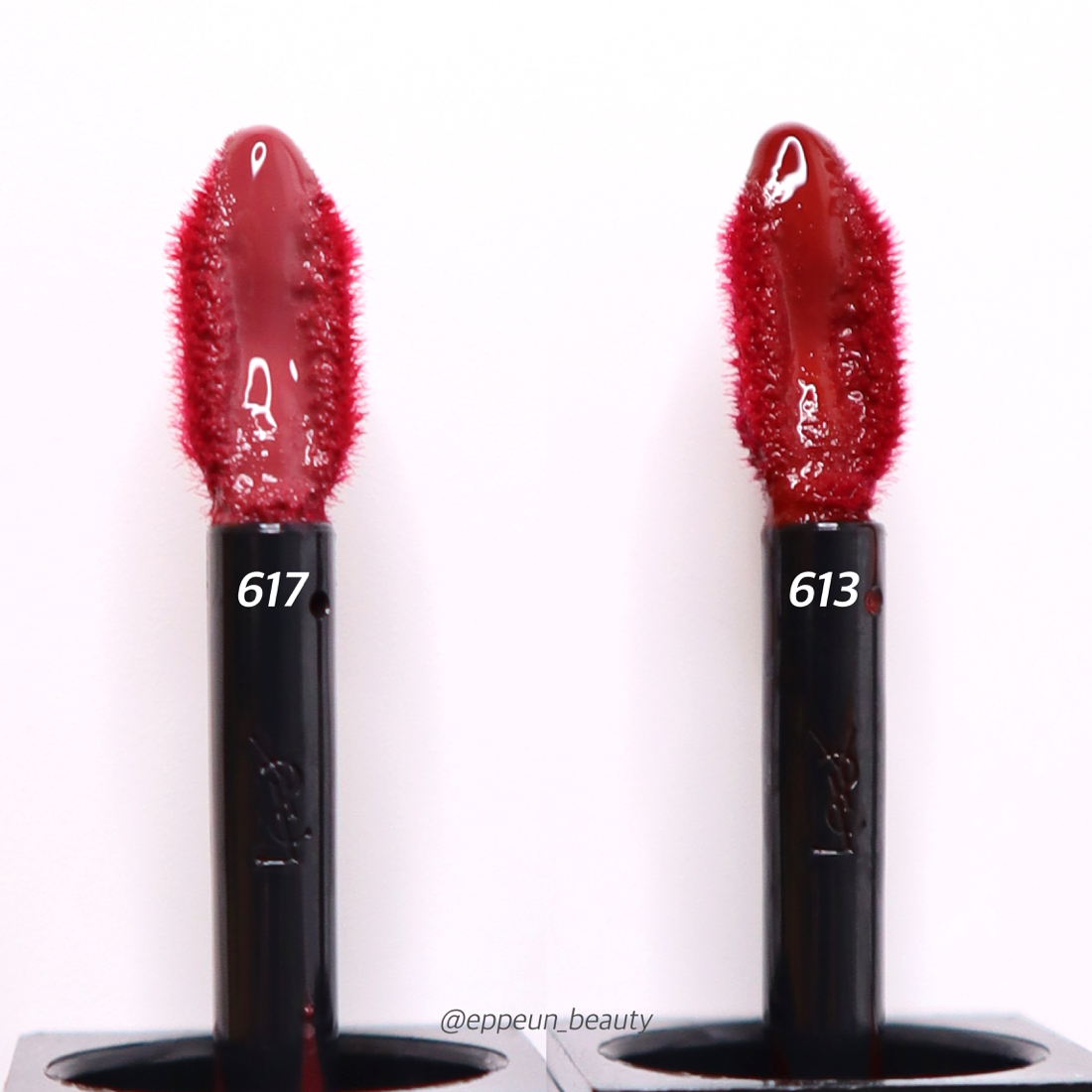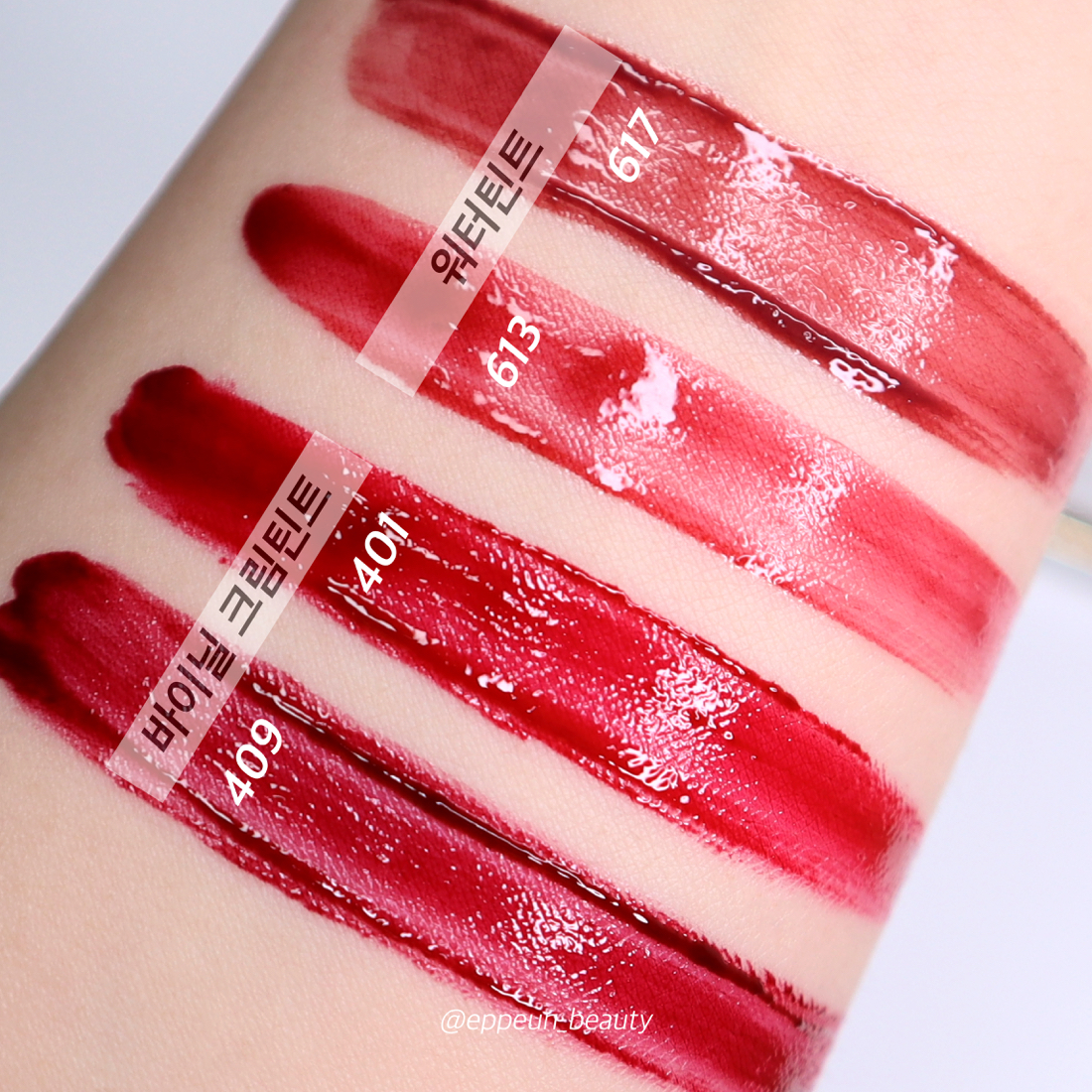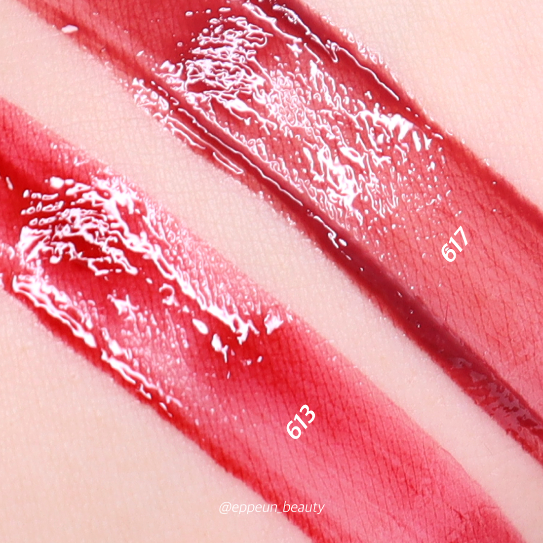 일단 입생로랑 워터틴트(613/617)는 바이닐 크림틴트(401/409, 일명 비닐틴트)에 비하면 이름처럼 물기가 더 느껴지고 촉촉하면서 맑고 투명한 느낌의 립틴트다.