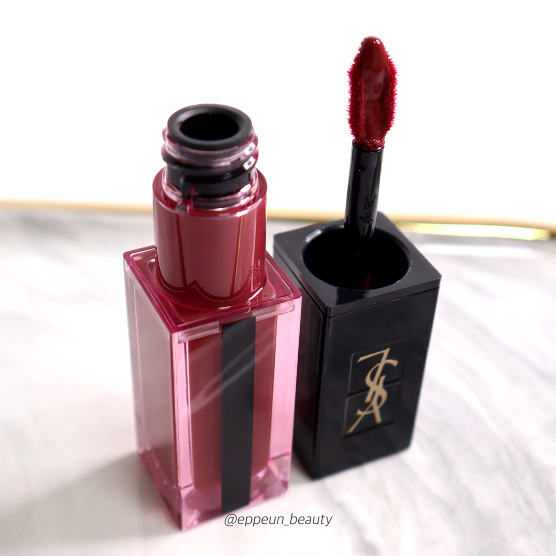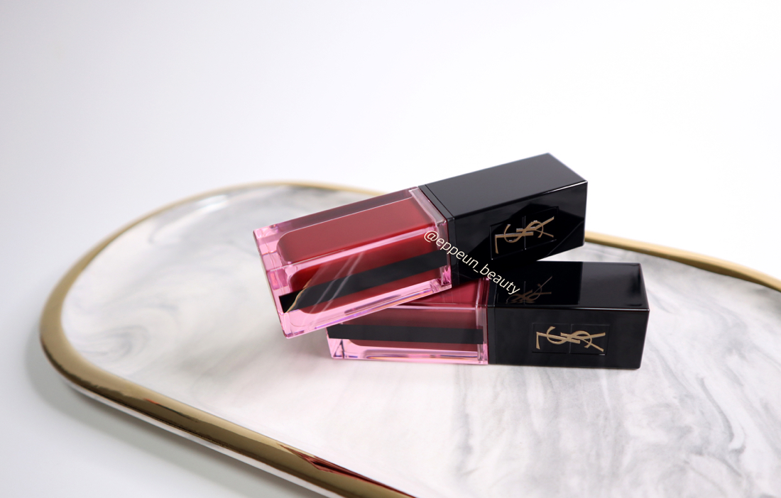꽉닫혀 있거나 블랙, 골드케이스의 입생로랑 뷰티 제품 패키지 디자인만 보다가 이렇게 투명하게 안의 내용물이 다 보이게끔 디자인된 입생틴트를 보니 우아한 느낌이 더 UP UP 된 것 같음. 그러고보니 요즘 이렇게 직사각형으로 각지면서 투명한 느낌의 틴트나 글로스 디자인 많이 보이는 듯! 글로시한 물먹립이 대유행이라 그런지 디자인도 그런 화장품 특징 따라가는 것 같기도!^^