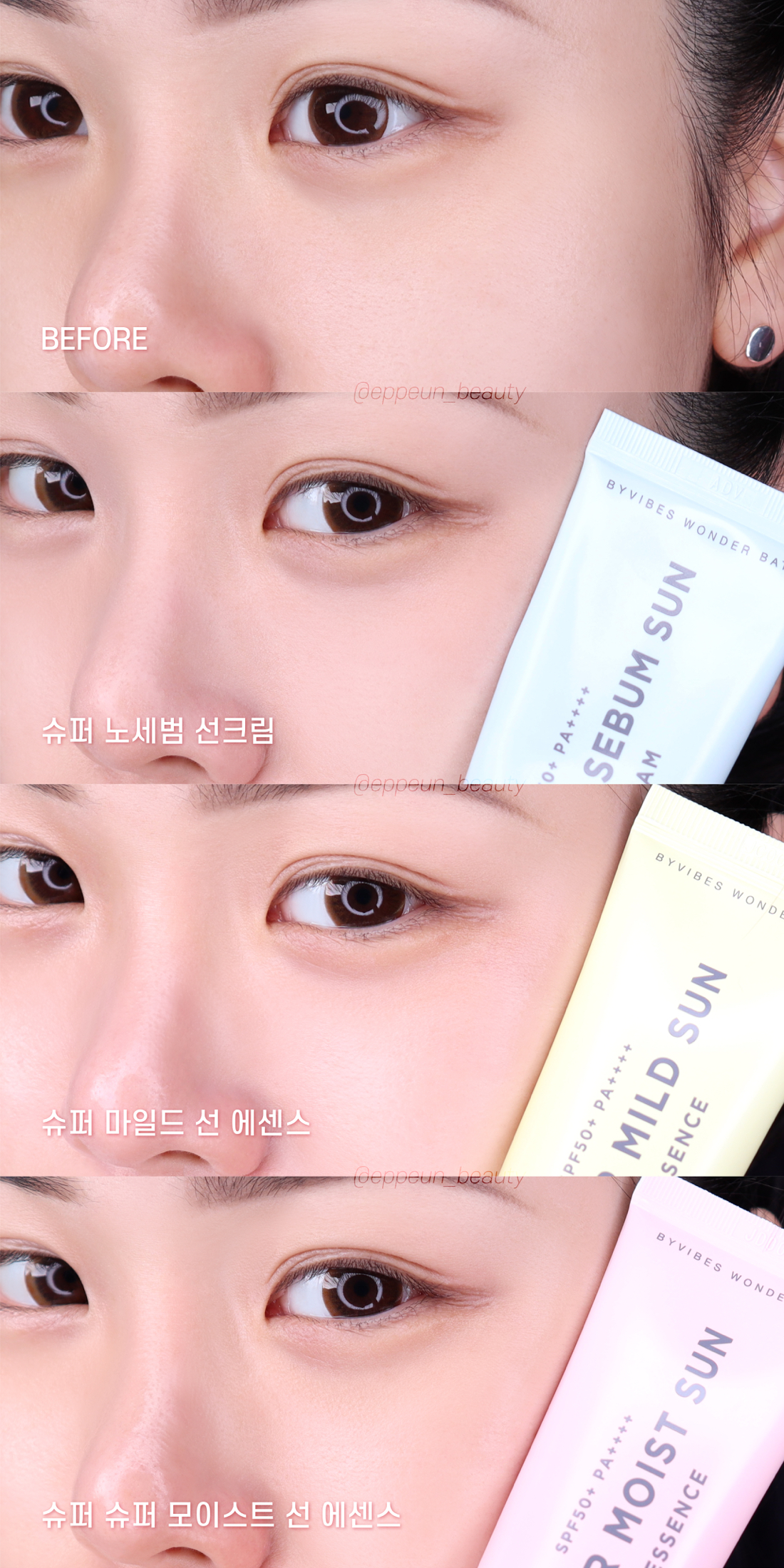 원더바스 슈퍼 선크림 3종 사용 전후 비교샷. 이렇게 보니깐 바르고 난 후 피부표현과 각각 제품 특징이 뭔지 대략 알겠쥬~? 원래 촉촉하면서 광나는 피부표현 좋아하는 글쓴이. 마스크 착용때문에 이런 베이스류 거의 포기하다시피하고 살고있어서 그런지 피부 표현 젤 예뻐서 개인적으로는 슈퍼 마일드 선 에센스 제품 제일 추천하고 싶음. 제품 성분도 순해서 그런가 요즘 확실히 피부 트러블도 덜 올라오고 붉은기 진정되는 느낌! 무튼 주위에 영업 엄청하고 다니는 선블록 제품이라 오늘도 주절주절 말많은 리뷰.^^