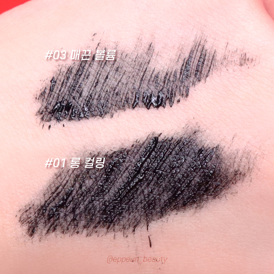 두 마스카라 손등발색 비교에선 딱히 차이점이 보이지 않았음. 두 호수 모두 수퍼프루프 마스카라답게 유수분에 강력했음. 유수분에는 강하지만 립앤아이리무버로 지웠을 땐 또 깔끔하게 잘 제거가 되는! 유지력 짱짱하면서 잘 지워지는 마스카라가 짱이쥬~! 그런데 클렌징티슈로는 거의 안 지워진다고 보면됨.