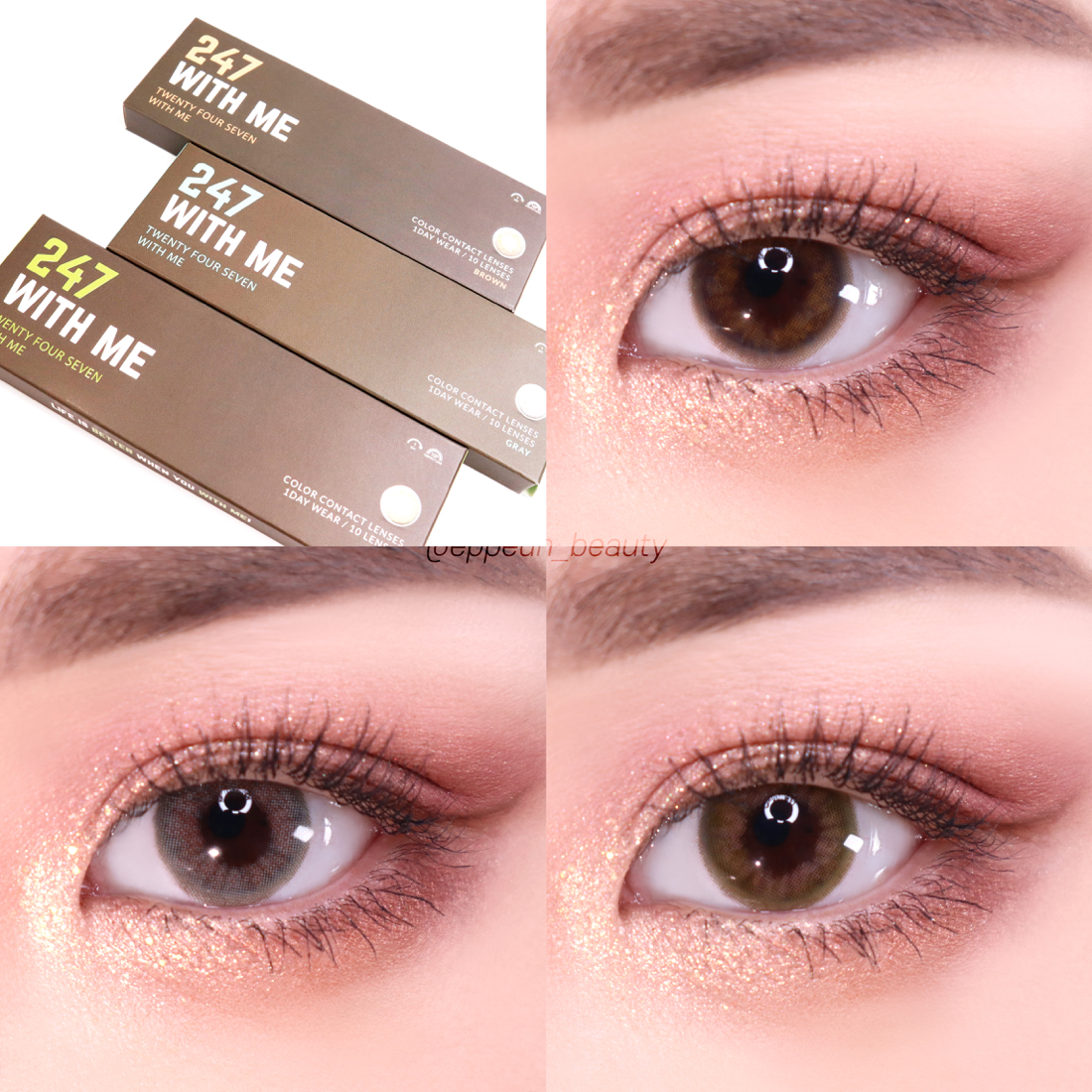 그레이나 올리브 계열은 자주 착용해서 역시나 만족만족했는데 브라운 기대안했는데 생각보다 넘 예뻐서 이것도 껴보고 반해버림. 쿨톤이긴해도 사실 렌즈는 다 예뻐보인다ㅠㅠㅠ... 자 그럼 이제부터 렌즈타운 247 위드미 렌즈들 컬러별로 각각 아이메이크업과 함께 발색샷 보여드릴게요~!^^