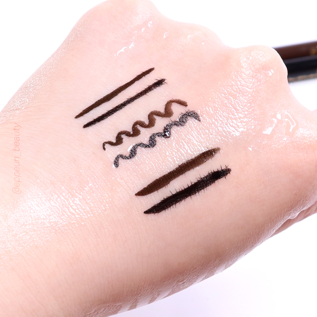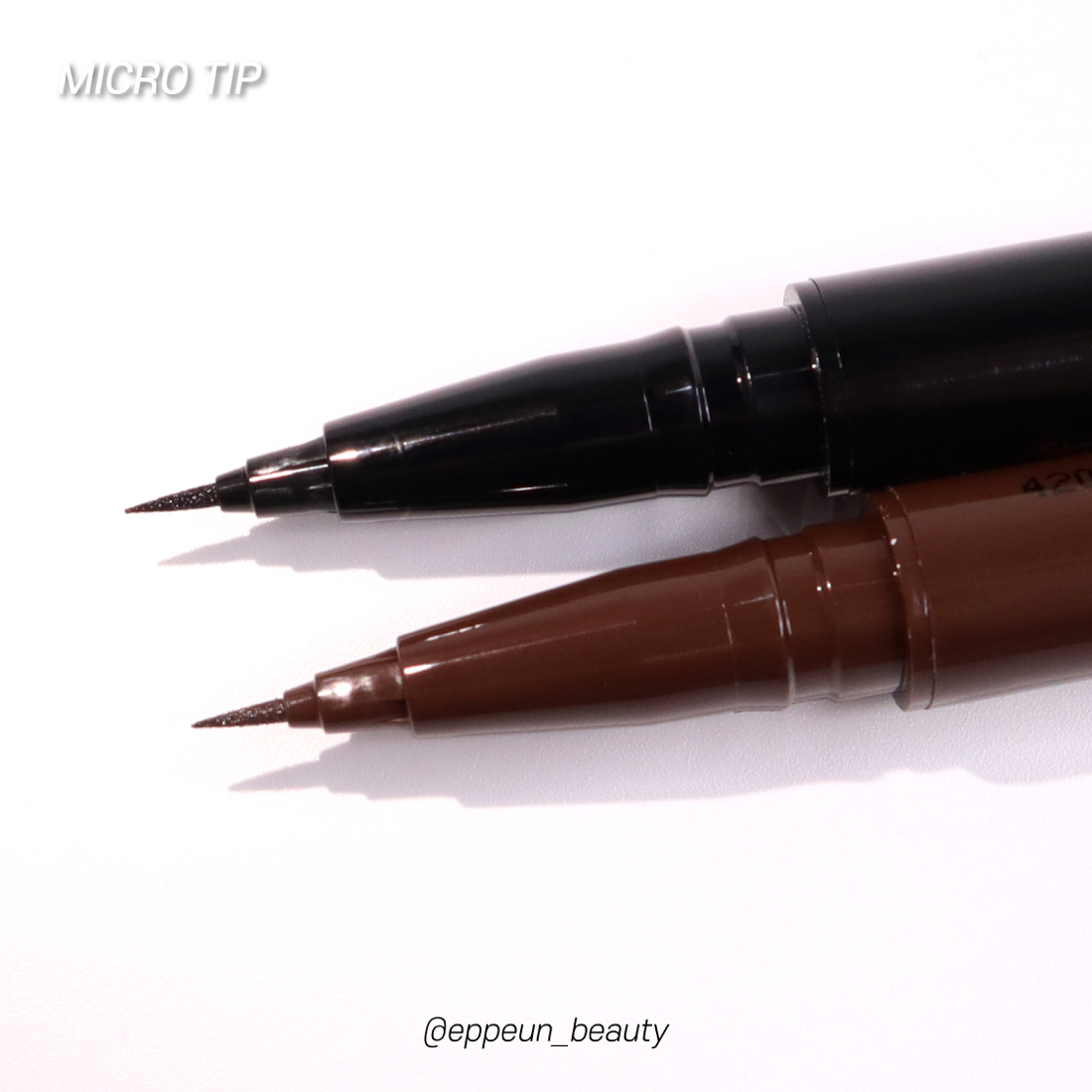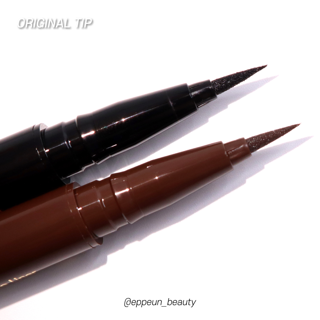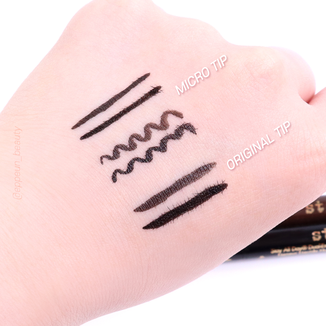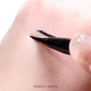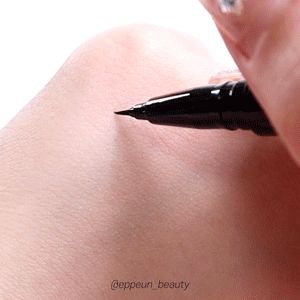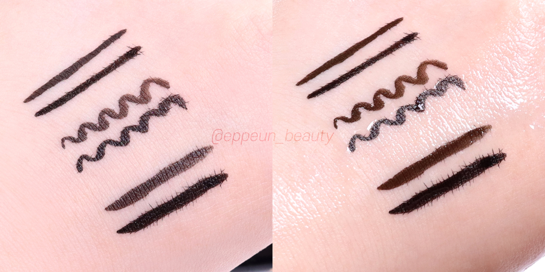 마이크로팁과 오리지널 팁으로 그린 라인 비교. 위쪽이 다크브라운 아래쪽이 블랙입니다~! 위 움짤에서도 보여드렸다시피 발림성 넘나 부드러워 라인 자유자재로 그리기 간편한 아이라이너.