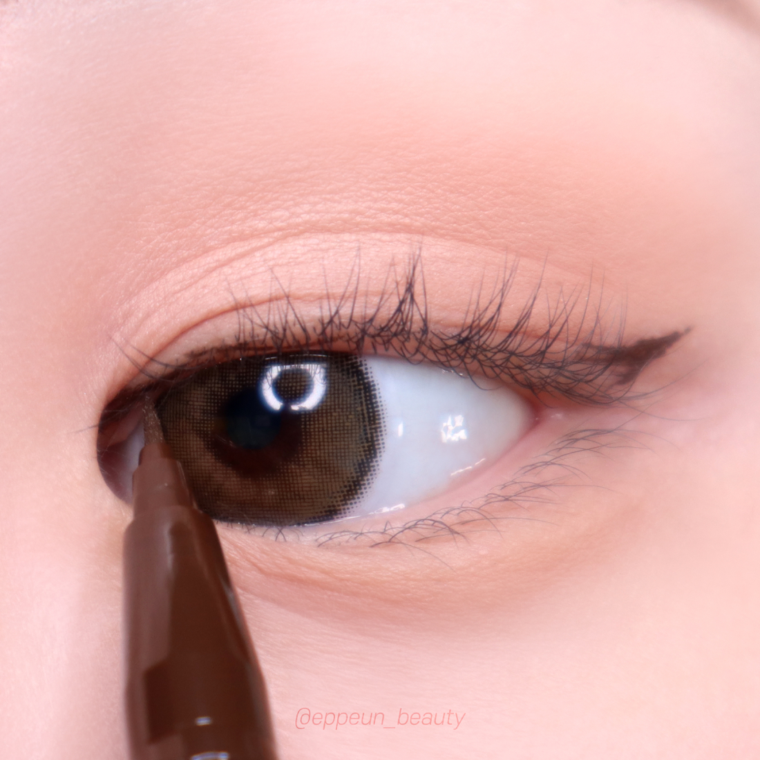 오리지널 팁을 활용해서 눈앞머리와 꼬리쪽 부분을 자연스럽게 슥슥 연결해주고 점막 부분을 채워줍니다. 오리지널팁이 부드러운 발림성이라 비교적 넓고 길게 아이라인 발색하기 수월하고 점막 부분도 자극없이 채워줄 수 있어 짱좋음.