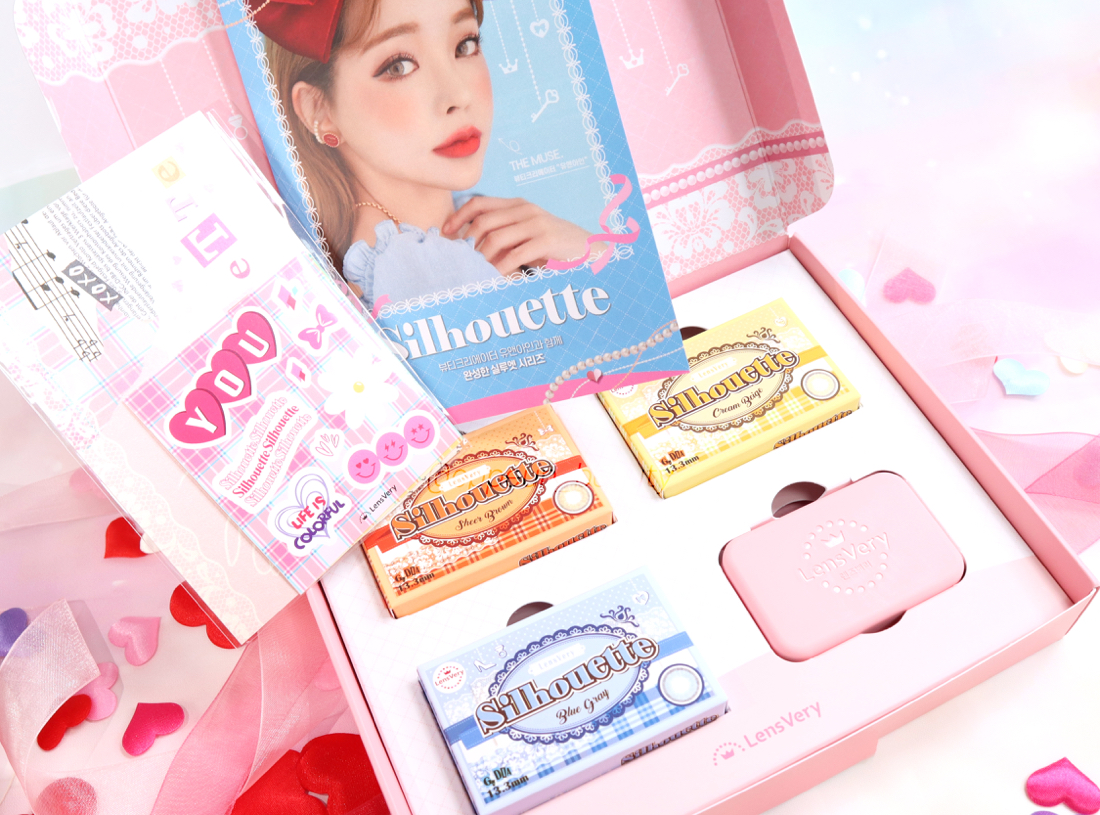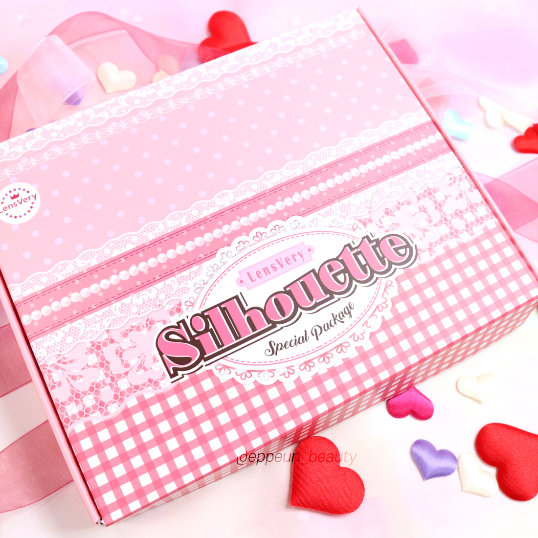 이건 선물로 받은 실루엣 시리즈 NEW 버전 스페셜 패키지. 실루엣 먼슬리 3종(크림 베이지, 블루 그레이, 쉬어브라운)과 실루엣 엽서, 그리고 스티커가 들어가 있음. 렌즈 개봉해보기도 전에 러블리 쏘 큐트한 패키지에 반해버림.