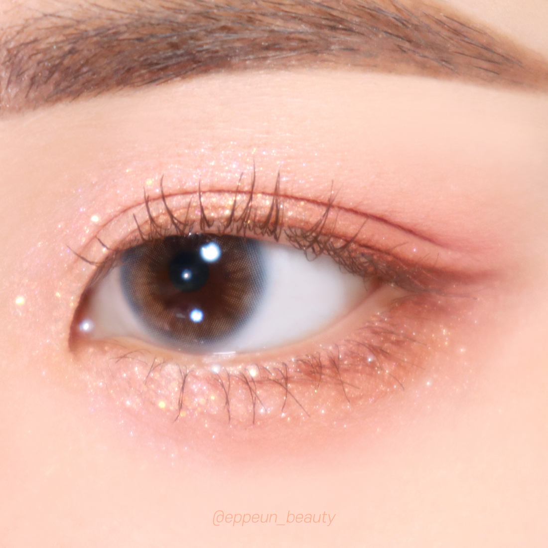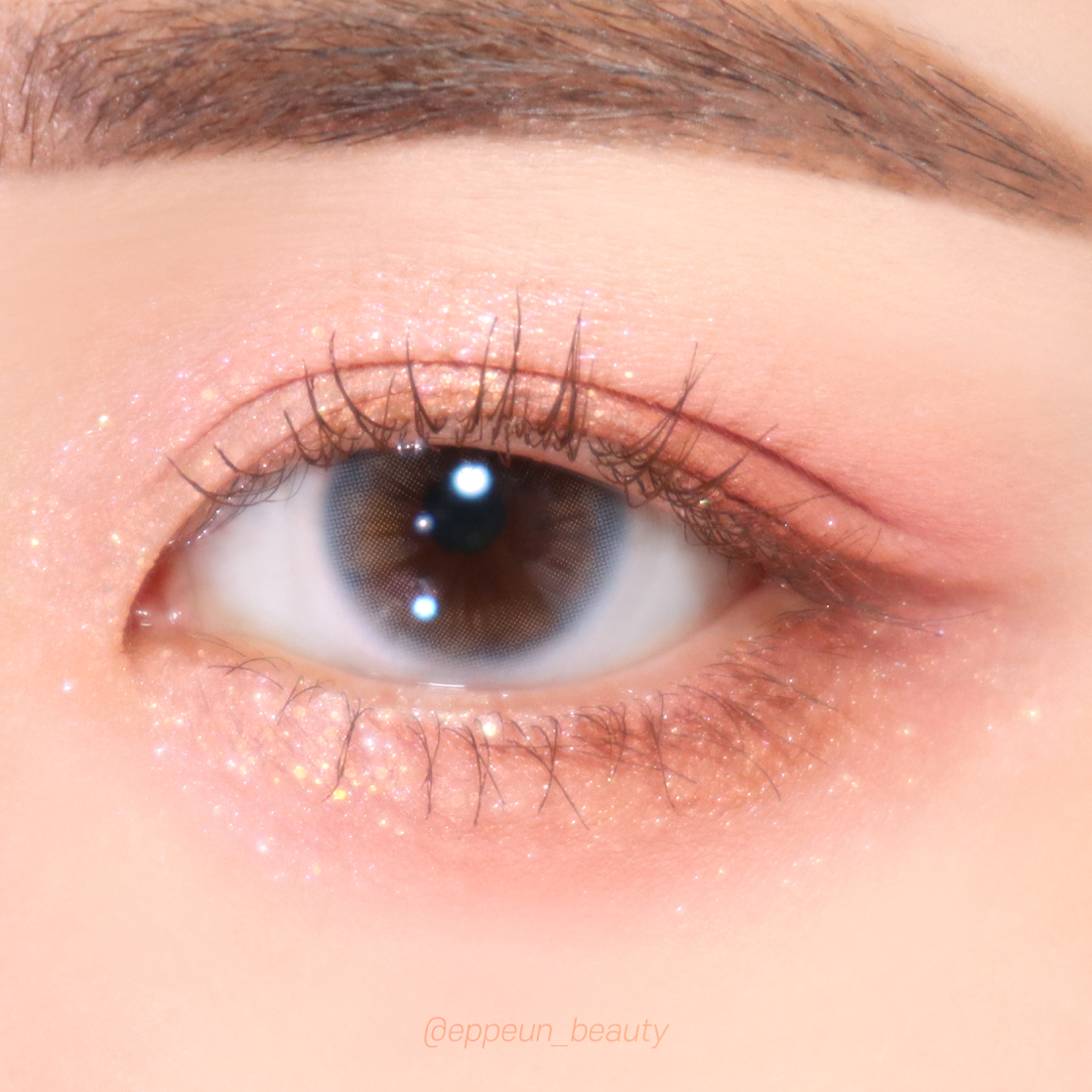 옅은 색감의 그레이 써클라인과 안쪽 브라운 컬러로 이루어진 모모 문 렌즈. 모모 시리즈 중에서 가장 데일리한 브라운 렌즈이다.