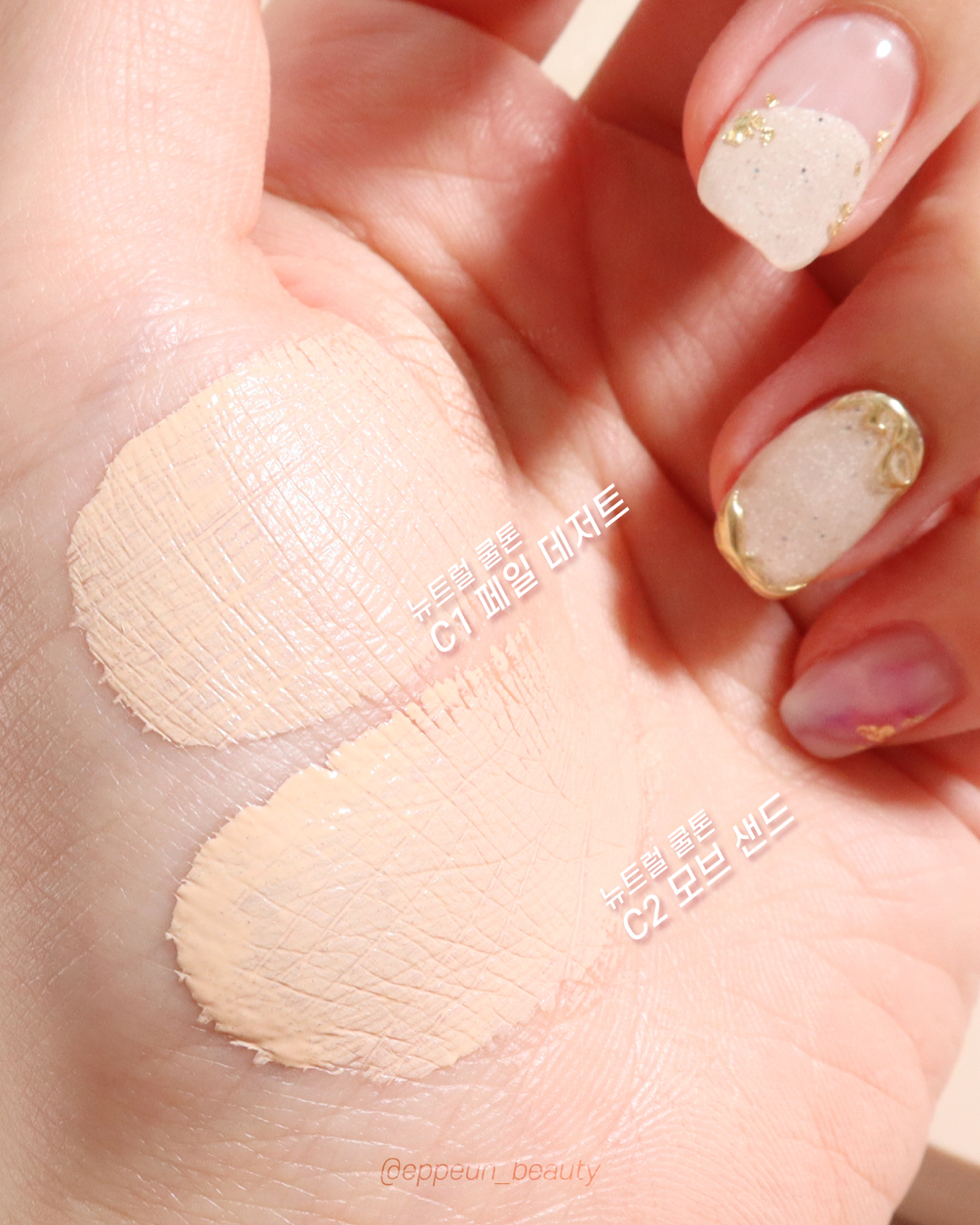 페일 데저트와 모브샌드 각각 다 발라봤을 때 겉으로 보기엔 그렇게 잘 구분이 안 감. 한쪽씩 같이 바르고 비교해보면 평소 13호, 17호 밝은 21호 사용하는 쿨톤 기준 확실히 페일 데저트가 더 피부톤이 화사해 보이고 잘 맞았다.