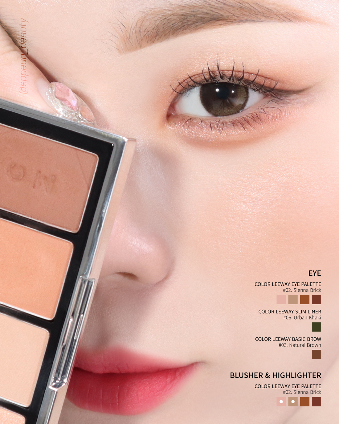 다음은 02. 시에나 브릭 활용한 아이메이크업 룩. 시에나 브릭은 캐년의 어딘가, 붉은 단층이 떠오르는 모험적인 브릭 오렌지 컬러다.