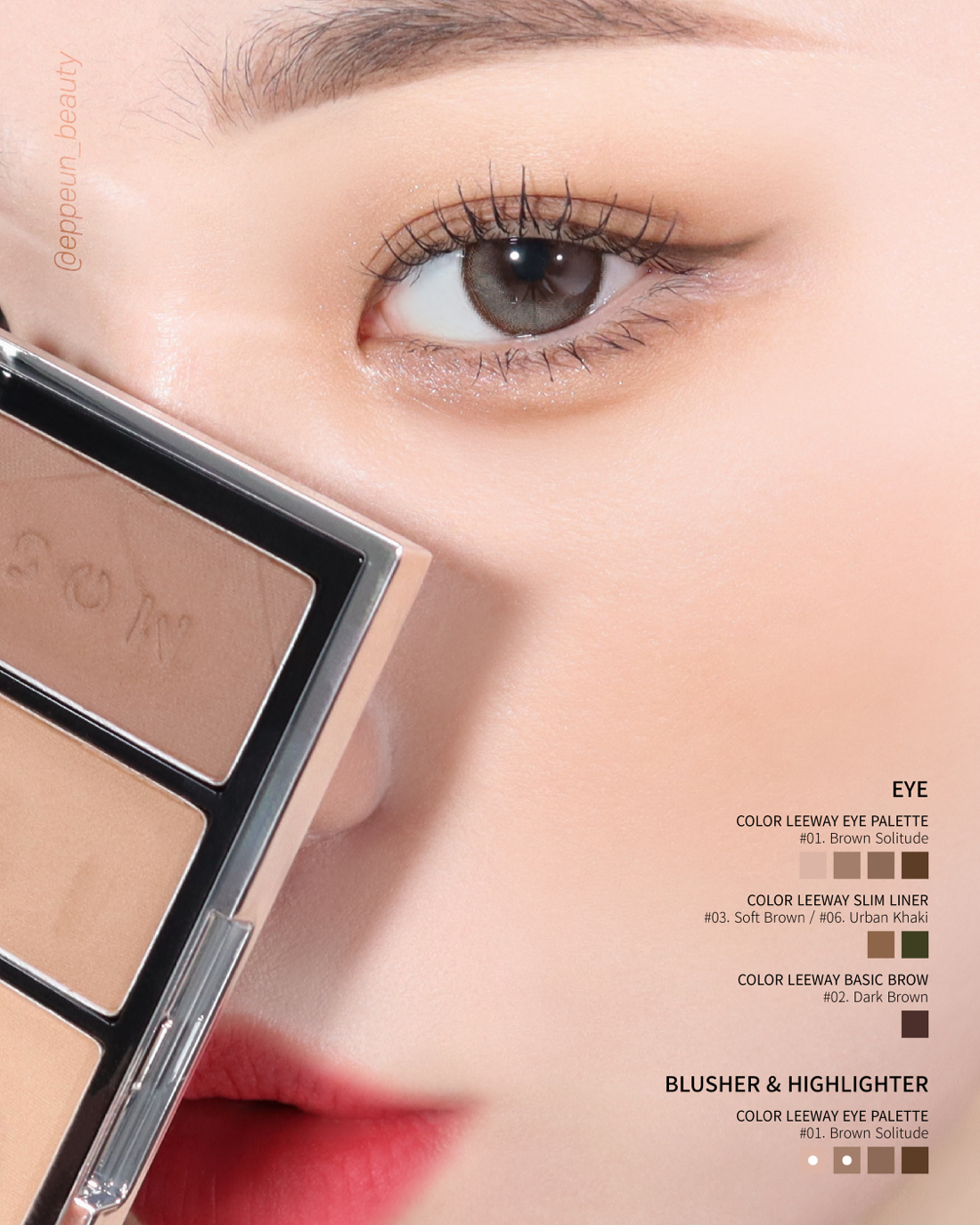 컬러 리웨이 아이팔레트 01. 브라운 솔리튜드 활용한 아이메이크업룩. 평온한 사막, 조용히 흩날리는 모래바람을 닮아 부드러움 속 담대한 시크함의 뮤트 브라운의 브라운 솔리튜드.