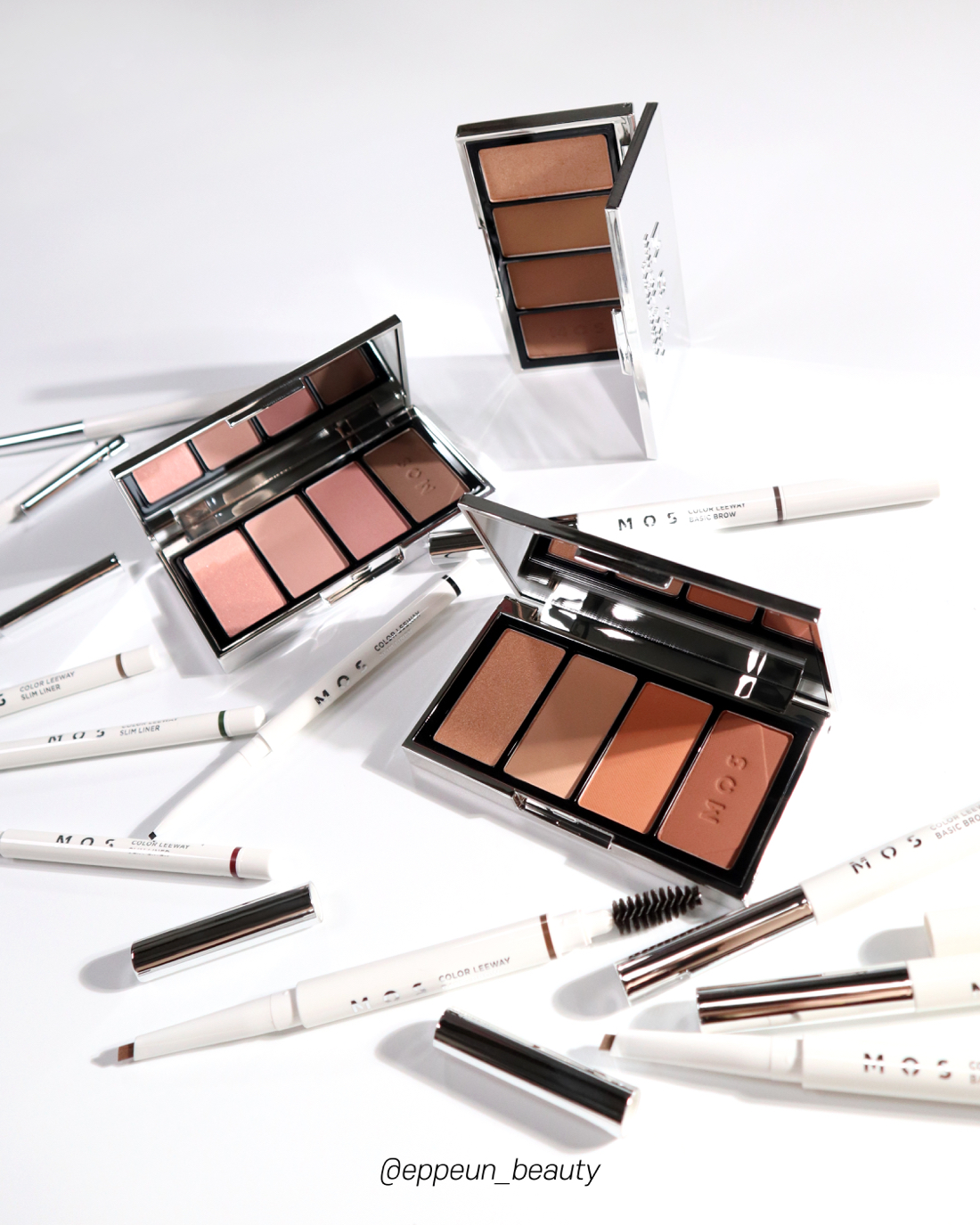 오늘 리뷰할 제품 모스 컬러 리웨이 아이 컬렉션 제품들 떼샷. 글쓴이가 겨울쿨톤이기도 하고 실버메탈 재질 제품들 아주아주 좋아함. 심플 고급진 느낌을 엄청 선호하다보니 모스 브랜드의 상징인 실버 메탈 소재의 패키지 감성 넘나 애정쓰~!