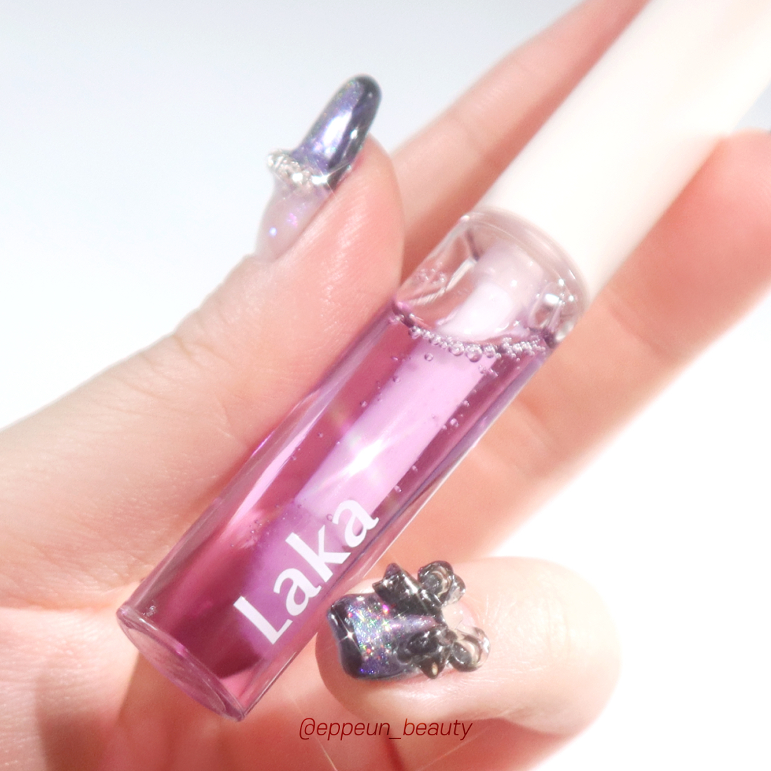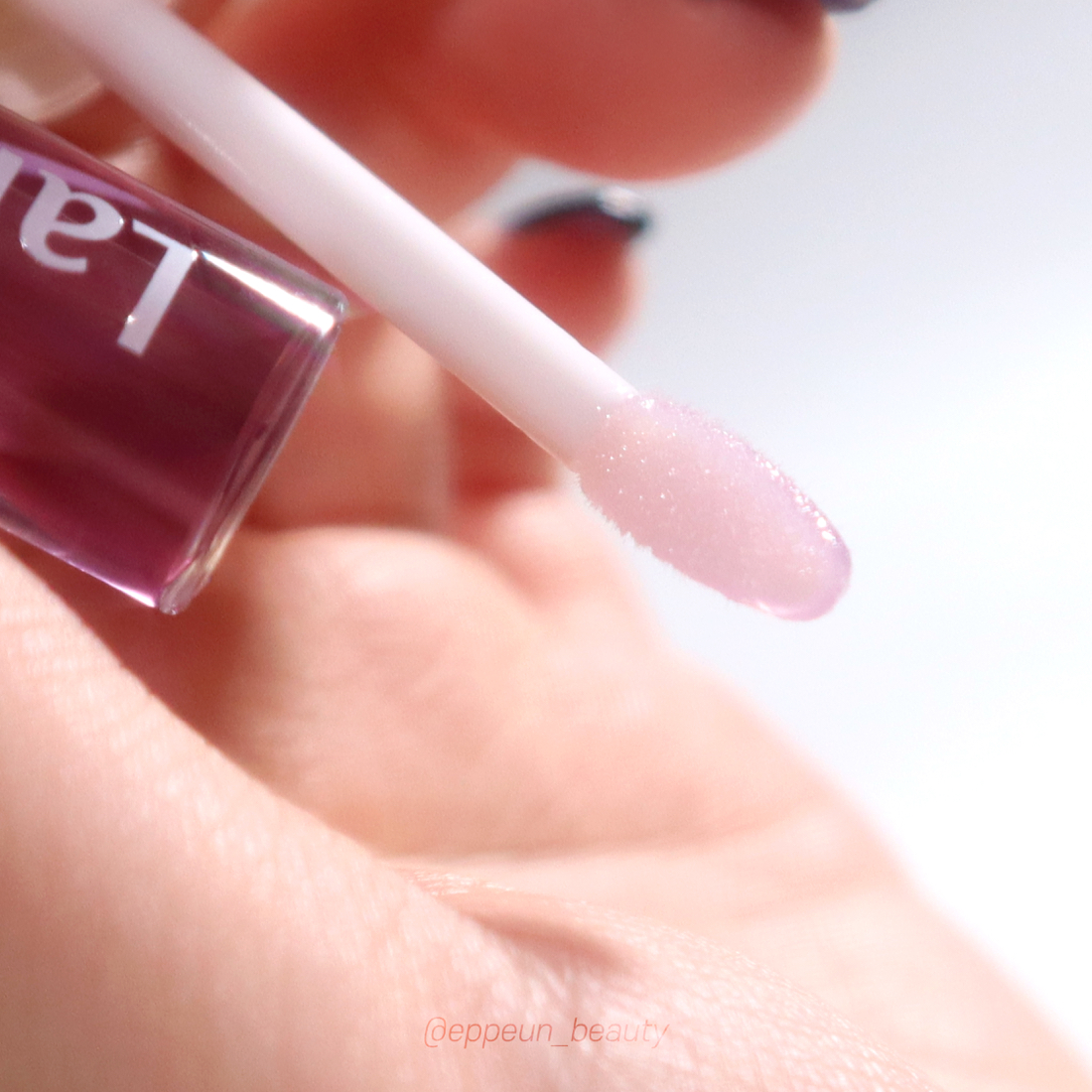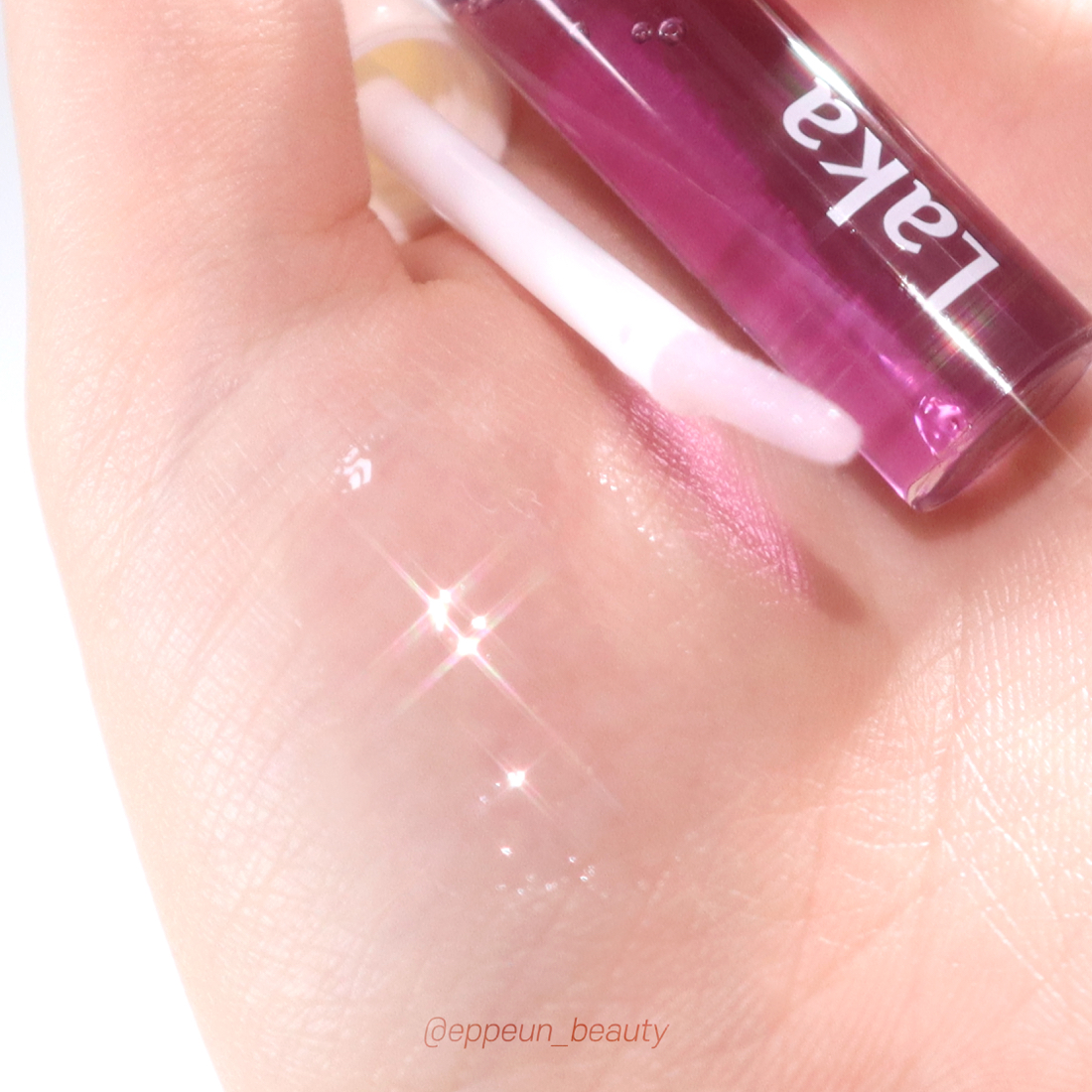 라카 립 오일 텍스처 보고 가실게요~! 손바닥에 살짝 바른 것만 봐도 텍스처 가벼운게 딱 느껴지시죠~! 보랏빛을 띄는 것과는 상관없이 바르면 투명 투명한 립오일임.